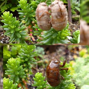 雨のやみ間にちょこっとセダムさんの地植えの様子を見に行くと💕 なんと😆セミの抜け殻😃 ちっちゃい子😂