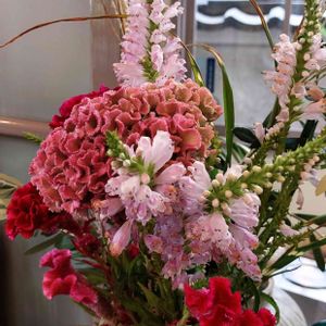 こんにちは~😆 気温30℃を下回り凌ぎやすそう☁️ ~ケイトウ&ハナトラノオ&ススキ~です💠 レトロな室内に 彩りキレイに生けられた秋の花々です💐 大きなケイトウの モフモフは 癒されます💓 [倉敷市 エル·グレコにて]