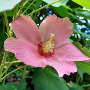 今日のお花 ~フヨウ~ です💠 少し高い処に キレイな彩りで咲いています💗 葉っぱの陰で涼しそう💠 アオイ科フヨウ属の落葉低木。 ハスの美祢でもあることから、 特に区別する際には 「木芙蓉(モクフヨウ)」とも呼ばれます。 花言葉:「繊細な美」「しとやかな恋人」など