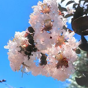今日もお疲れさまでした☀️😵💦 ~サルスベリ(百日紅)~ です💠 白色の花びらが、 青空に透けるように見えて、 とてもキレイです✨ 中国南部原産の ミソハギ科 サルスベリ属で 10mにもなる落葉高木です。