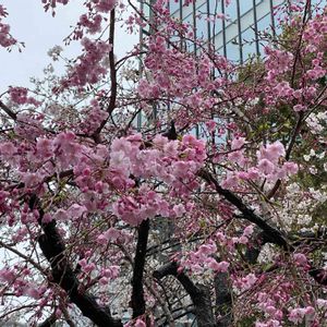 雨の日 ビルの谷間の枝垂桜🌸 まだ咲いてて良かった☺️