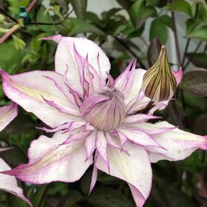 八重咲きのクレマチスが元気です。 こちらはレディキョウコ。ベランダのフェンスに誘引しています。 昨日のカシスもそうですが、白地に色の粒子が並ぶ砂絵のような不思議なマチエールなんです。 そのため乾いた雰囲気に見えます。花持ちも良いし… 超人気の水面の妖精もそうですよね。 この乾いた雰囲気に見える色のつぶつぶに見入ってしまいました👀💜