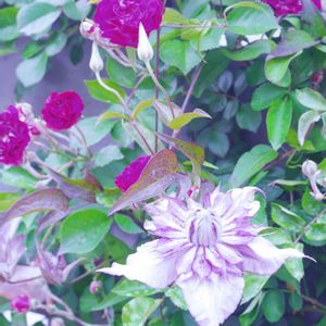 遅咲きクレマチス、四季咲き🌹坂野ローズのオールライフインブルーム、オールドファンタジーを浮かべてみました。 隙間に入れたパクチーが臭せぇ🤣