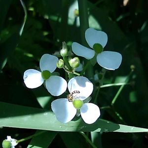 ヘラオモダカ(箆面白高) オモダカ科サジオモダカ属 一株だけですが 水溜りに咲いていました🤍✨🙌 葉はヘラ形、葉柄と葉身の区別が不明瞭 花茎に3〜6本の枝を数段輪生する 花弁は3mm 白色〜淡紅色 午前11時頃開花 4時頃に閉じる🤍✨ 分布: 日本全土 朝鮮、中国、台湾、インド 水田、休耕田、湿地、溜池 花期: 7〜9月 東京都: 絶滅危惧Ⅱ類(VU)