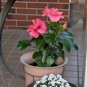 イベリスがこんもりといい形になってきました🙂 後ろのハイビスカスの濃いピンクが引き立てています。 鉢を二重にし、テーブルの下に置いているのがいいのか花持ちが良いです🌺