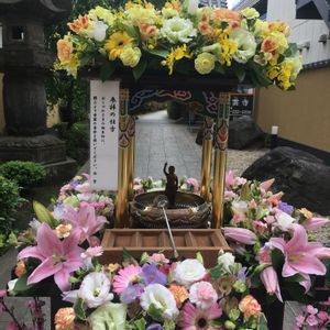 昨日、茨城県のフラワー装飾技能士会の会長さんが発起人で「花供養」が行われました🌸 花に携わる者として参加させて頂きました。とてもいい経験でした。 左の写真、よく見えないけど仏像が三体中にいらっしゃって、まずは甘茶をかけて... 右下は玄関にあった雪餅草 珍しいのでパチリ📷 お経が始まると雨がすごい勢いで降って来て雷⚡️まで😱 お釈迦様が生まれた時、甘茶の雨が降ったそうなので、そういうコトかな これからもお花に感謝して飾らせていただきます😊