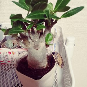 アデニウムって、こんなにお手頃で買えるんですね🌱 コメリでトックリランとアデニウムが598円🌱 ちょっと悩んで、一度は帰宅…。 でも気になったんで、もう一回行ってお迎えしました🎵 トックリランも気になるなぁ🌱 ポニーテールって名前も、なんだか可愛い💠 台風からは離れてるのに、風が強くて窓辺に置いてたカポックが転落(-_-;) 台風お気をつけくださいませ➰🌀