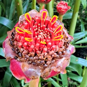 「トーチジンジャー」 別名(カンタン) ショウガ科の多年草🎵 トーチ(松明)の様な球状の花🌼 果実は、生食で種子は香辛料に利用されるらしいです😆🎵🎵 チーム・ブルーの花友さん かおるんるんさんのキリ番お祝いpicです😉💖 これを掲げてリハビリ頑張って下さい🙏💃💕 🏷️真赤な火曜日 に参加します🙏