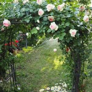 去年組み立てたアーチ。名前はわからないバラだけど、毎年元気に咲いくれます。