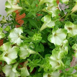 ペチュニア サントリーさんあずきフラッペ ものすごい形で咲いてます 虫に食べられてだめかなぁーと思って消毒後放置してたらお花咲きだし後は頑張れーとカットする事も出来ずだけど咲いてます💞🤗