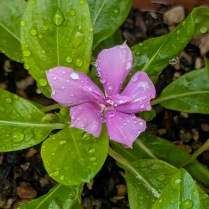 小庭の挿し芽からのニチニチソウ 台風🌀からこちら水やりをサボっていました いつの間にか咲きました 1️⃣まだ10センチにも満たないのに‼️ 2️⃣これは15センチ位 🏷️水滴の水曜日
