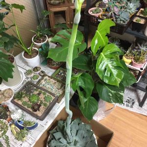 連続失礼します_(:3 」∠)_ 見つけてしまった… 花芽付き…アガベ。。。雷神。。 園芸店には斑入りのモンステラを探してください(о´∀`о)と注文して、昨日微妙やけど斑入りのモンステラ競り落としたよ😆連絡が来たので今日引き取りに行ったら… まさかの雷神😳😳😳😳😳 お値段1200円。。 斑入りのモンステラも破格にしてくれました(о´∀`о)ありがとう😊また、買いに行くよ😆😆😆 さて、子株はなしの雷神さん。 花を拝みますかな🤤🤤🤤