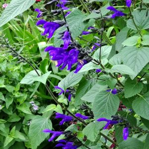 メドーセージは サルビア ガラニチカの別名でも呼ばれます。 シソ科なので 花びらは特有の唇型で 花茎に10輪以上 連なって咲きます。 セージと言うとメディカルハーブやアロマテラピーを思い浮かべますが メドーセージは食用のハーブではなく 観賞用のハーブです。 花色は濃い青や深紫で 萼や花茎の黒 葉っぱの緑とのコントラストが とても素敵です。 ブラジル アルゼンチンなど南アメリカ原産。 シソ科アキギリ属の多年草。