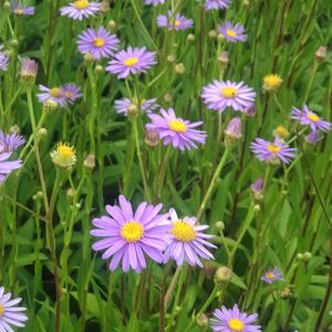 このお花は チョウセンシオン(朝鮮紫苑)です。 名前の通り 朝鮮半島の固有種で チョウセンヨメナ(朝鮮嫁菜)の別名でも呼ばれます。 日本には 観賞用として 大正時代に渡来した帰化植物なのだとか…。 青紫色の舌状花と黄色の筒状花のコントラストが素敵です。🤗✨ 朝鮮半島原産。 キク科シオン属の多年草。