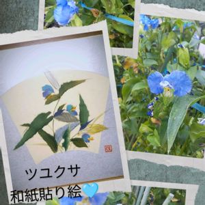 おはようございます😊 今日のお花🩵ツユクサ🩵 草津市のお花「青花」 大花ツユクサ🩵 朝一番のお花を摘んで、もんで、その汁を刷毛で和紙に何度も重ね塗りして作られる「青花紙」 着物の下絵描きには無くてはならないもの。 と、何気に、 和紙貼り絵🩵ツユクサ🩵