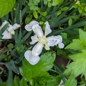 和庭へようこそ☺️ 昨年咲かず消えてしまったと思っていたホウチャクソウ(宝鐸草)が生きていました バックは斑入りのアカンサスホワイトウォーター シャガも咲いています 最初の一花が開花のヒメヒオオギアヤメ とワンサカ咲き出したチリアヤメ シラユキゲシ トラディスカンチア胡蝶の舞のお花
