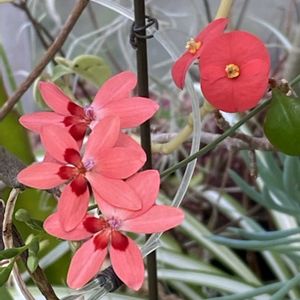 ハウス内で早くもヒメヒオウギアヤメが咲き始めました。 こぼれ種で、他の鉢や床のあちこちで咲いています。 たまたまトゲなしハナキリンと同じ場所に咲いていたので、赤花ツーショットです。 ②③ それぞれの花のアップ写真で す。