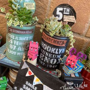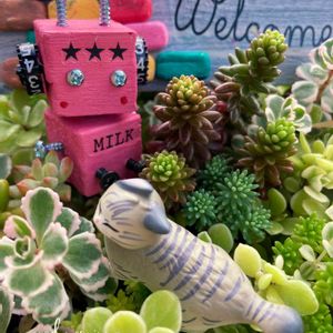 🍀寄せ植え🍀 GSのふぅ♪さんから頂いたステキなリメ缶に寄せ植えをしました✨ お店に行ったけど元気な子に出会えなくてうちにあった小鉢に植えられていた子達を寄せてみました✨😊 しばらく日陰で休んでもらって秋にはモリモリになるといいなぁ💕 ホント素敵なリメ缶ありがとうございました(⑉︎• •⑉︎)♡︎ 最近ハマっている犬ロボ🤖と一緒に