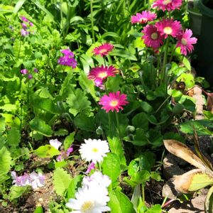 おはようございますo(^▽^)o やっと春☘️の陽気?というより初夏の陽気になりそうですネ。 嬉しいこと、残念なことの報告です。 嬉しい事 ①サントリーさんのボンザマーガレットが復活していっぱい咲いてくれそうです❣️ ②白ヤマブキも咲き始めました❣️ 残念なこと ③④ピンクのチューリップ🌷も一つ咲きました。しかし、生協さんで買った球根、④のような切花ブーケ💐になるはずなのに😢 ⑤日本サクラソウ、葉は盛り盛りなのに、花芽は2つでした😂
