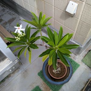 オキナワキョウチクトウの成長が凄まじい! 同じキョウチクトウ科のプルの隣に置いてますがやっぱ葉が似てますね^^