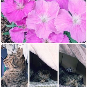 おはようございます🧚🏻🩷 連休の朝です•ᴗ•ꕤ* ピンク色のナデシコさんと 地域猫のしーちゃんが抱っこして甘えん坊になりました(´▽`) '` '` '` 急な雨降りの時にはダンボールハウスに避難です 雨風はしのげてますよ🍃🌀🍃☔ 雷⚡️は怖かったね😱