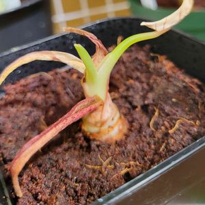 残念な😖 アロカシア・エレーン この子は1ヶ月前かな? 買ってきた時は葉が5~6枚あったけど植え替えた途端一気に枯れた😨😨😨 こんなこと初めてだったけどとりあえずイモは大丈夫そうだったから繊維質で植えて様子見てたら何か伸びてきた✨ ドキドキするわ😲