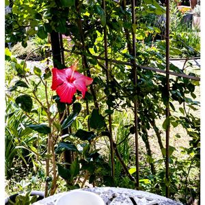 おはようございます☀ 朝からお洗濯に忙しい 合い間に庭パトそしてコーヒー☕️タイム 忙しいけど晴れた日の朝はご機嫌です🥰 部屋からベランダに戻したハイビスカスに 今年初のお花 まだ初々しい一輪のお花を愛でながら2杯目のコーヒーをいただいています😊