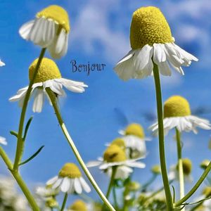 青空に向かって 元気に咲くカモミール… 素敵な香りをクンクン♪ 今日もガンバろう❗️٩(^‿^)۶