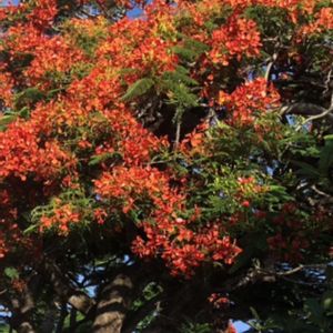 鳳凰木(ホウオウボク)と空のコントラストが眩しかった✨ 花を見かけるたびに、蝶が飛んでいました