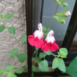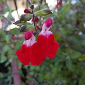 チェリーセージ ホットリップス 白とのツートンカラーのはずだけど、気温の高低で赤、ツートン、白と咲き色が変わります‼️ 真夏には赤と白のコントラストが楽しめるでしょう☘️