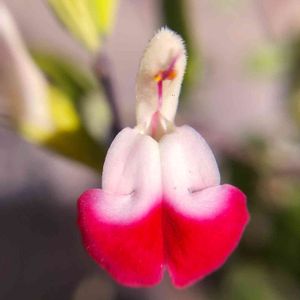 よく見ると、なんとも面白い形と色分け❤️ エクボのある顔?ウサギ🐰? 横からみたら鳥の雛? チェリーセージのホットリップスという種類とのこと😍