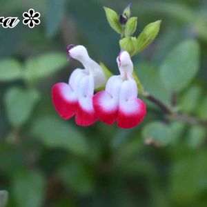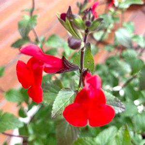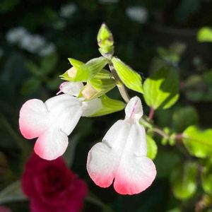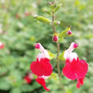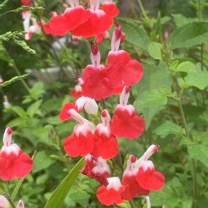 私の初チェリーセージ ホットリップスが開花しました✨😄💕 もう気温が高めなので白色はほぼないですが、ハッキリした赤色が素敵で下膨れな形がカワイイですね🎵