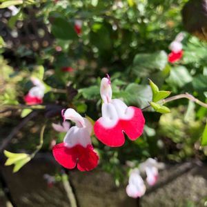 赤、赤/白、白の3パターンが❤️⚪️🔴 チェリーセージは総称だそうで、これは、 サルビア・ミクロフィラの改良種のホットリップス 気温が高くなると赤が多くなるそう🌡 同じ場所に咲いているので、気温には大きな違いはないけれど、赤、赤/白、白の3パターンが一度に楽しめます😀