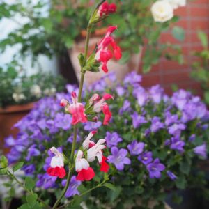 今日は10輪ちょっと咲いている、チェリーセージ ホットリップスです♪ 1つだけ桃色にはなっていましたが、残念ながらバイカラーは無し😅 でも、たくさん咲くのが楽しみです🎵