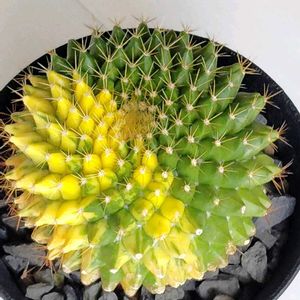トウモロコシみたいな斑が綺麗な金洋丸錦ちゃん✨ たま〜に行くサボテン生産者さんのサボテン満タンのハウスの中でポツンと斑入り😳 黄色好きのDANKは勿論一目惚れ🤭 世界の図のマミラリアバージョンみたいな感じのとっても明るい雰囲気で、稜の間のモフモフも可愛い😍