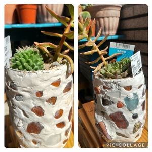 🏷️毎月8日は鉢の日 10数年前に、次男の夏休みの工作で、海で拾った石やガラスを缶に紙粘土で張り付けて、私も一緒に作った筆立て。 今では、底に穴を開けて、多肉の鉢として大活躍。 ここに植えた子は、一年近く経っても元気です😌💓
