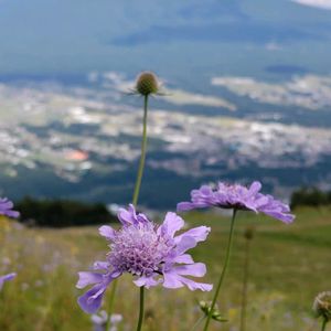 入笠山(すずらん山野草公園)と入笠湿原へ行ってきました🌿❀🌿❀🌿✨⛰️ マツムシソウと八ヶ岳、冬はスキー場のゲレンデになるここからの眺めは最高です💜▲▲🎶 ⑤八ヶ岳の八つの山が全て見えます。中央の少し白っぽく見える山が最高峰の赤岳(2899m)です✨⛰️ 入笠山にて…2025.9.2 その1