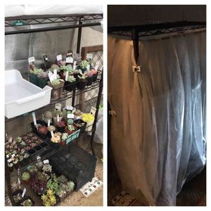 なんだか妙な画像に💦 昨日は多肉棚にカーテンをしてみました。 温度計で測ってみたら、夜の12時で7度。そこまで冷え冷えというわけではなかったかな。 不織布のカーテンは、風を防ぐことができるので採用しました。 ビニールも考えたけど、私は忘れっぽいので、開け忘れたら…と思うと恐ろしくて😥 ・カランコエとビアポップ とアロマティカスは、12月から夜は軒下で不織布のカバー ・他の多肉は5度以下や風が強くなりそうだったら、軒下で不織布のカーテンをする ・寒波や、雪の日はそれプラス不織布のお布団をかける ・地植えは霜がおりる時は不織布カバーをかけてあげる ・だが、地植え秋麗はスパルタ放置( ˊ̱˂˃ˋ̱ ) でいってみよー! って、逝きませんように…😥😥💦