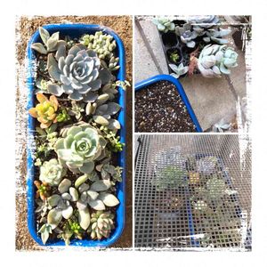 HCに行ったら、処分品コーナーに多肉のカット苗セット発見。 498円が200円に😃 3つあったのですべて購入してみました。 1つは、底が水でベチャベチャになっていて駄目になっていた葉も見えたので、どうだろう〜💦と思ったんですが開いてみると案外痛んでいなかったのでラッキー✨ 持っていない種類の、大きめのエケベリア、なんだろう? 値段札が黄ばんでいるし、どの苗も根がでまくっているので、長い間カット苗の状態だったようです。 この状態ですが、もし名前がわかるかたいらしたら、教えてください🙏