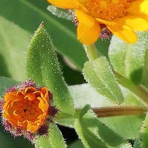 🍀野の花・フユシラズ (冬知らず)2🍀 【フユシラズの特徴】 茎・・・・やや横に這ってひろがり、綾がある。 くも毛及び腺毛がある。 葉・・・・互生し、長さ約7cm以下。低い鋸歯があり、無柄。 総苞片・・長さ約0.5~1cmで、腺毛がある。 名前の由来: 耐寒性なので、冬でも霜にも負けず次々に鮮黄色の花を付けるため。 同属のキンセンカよりも小さい1~2cmの花を付ける。 日が当たると花が開き、夕方になると閉じる。