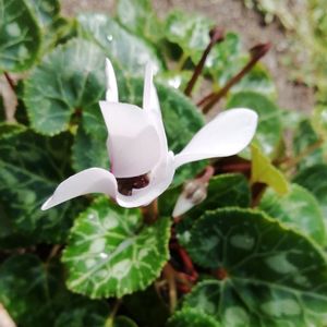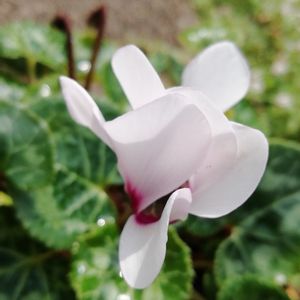 🌿シクラメン 1🍃 ふと気付いたら、いつの間にか シクラメンの花が咲いていました😲 休眠させないで夏越しさせようと 水やりしてたのですが・・・ この時期花を咲かせていいのでしょうか❓ でも、朝日を浴びて とても綺麗だったので✨✨ 記念撮影を📷・・・