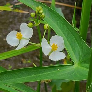 守谷市の田んぼにて オモダカ(面高) 『面目が立つ』や葉が矢尻に似ていることから、別名『勝ち草』とも呼ばれ、戦国時代には多くの武将が家紋として用いたそうで、日本10大家紋の1つだそうです。 食用のクワイはオモダカを改良した栽培品種。 オモダカの塊茎は小くて苦いらしいです。