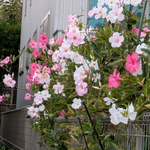 バス停2つ離れた測量事務所のマンデビラ 毎年見事に咲かせてみえます。 撮りたいと思っていて、やっと撮れました。