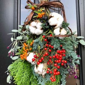 お家で育てた綿花と友人に頂いた針葉樹でスワッグ作り🌲玄関の出入りが楽しくなりました😊