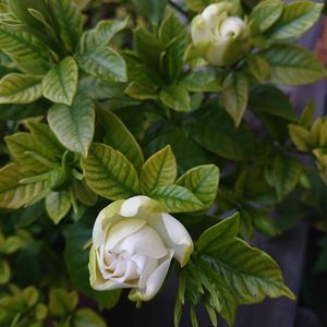 (母No.152)やっと3年目にして母には見応えありのクチナシの姿になってくれたようです❣️蕾がいっぱい〜って咲くのを楽しみにしていた母に笑顔がいっぱい‥たぶん(#^.^#)