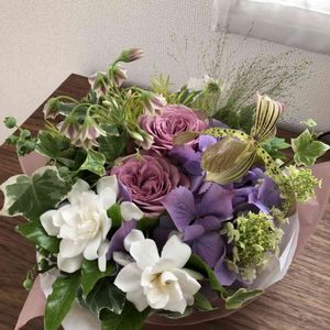 クチナシ、バラ、紫陽花、蘭のアレンジメント🤍