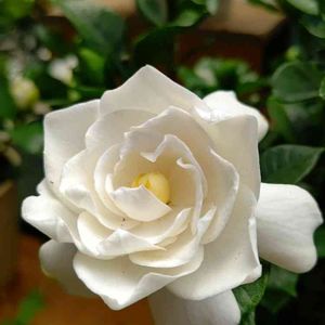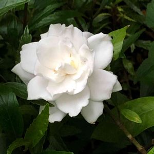 八重のクチナシ。 4センチ位の大きさで咲いていました。香りが良いです〜🎶 咲き始めの頃は葉が黄色になっていましたが、やっと緑の葉が多くなりました。