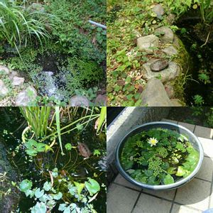 小さな池のすみっこに白い花をつけたクレソン(たぶん、クレソンだと思う😅)が咲いています。 植えたはずがないのに…何処から来たのだろう〜?! メダカさんたちは今日も元気! 睡蓮の若葉も出てきました。