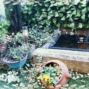 お庭の小さな池。 私のお気に入り。 小さな頃から夢だった庭に池を作って金魚を飼うことが叶い本当嬉しい限り。 池の周りには龍のヒゲ。 中にはホテイ草を入れてます。 とても目立つこの金魚さんはこの池の中で1番大きな金魚で蝶尾。 お気に入りさんです。
