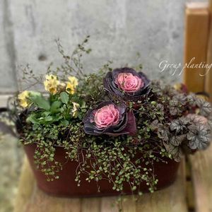 もう葉牡丹は買うまい と決めていたはず なのに~ このアンティークさに⋆⸜♥️⸝⋆ 負けました➳ (⸝⸝⸝°◽︎°⸝⸝⸝=͟͟͞͞)♡ ラベルもブランドも気にせず 花姿だけ見て手にとったビオラは 今年もやっぱり花日和さんビオラ✨ 今回使った苗は葉牡丹1ポット(3本入り) 内1本は小さくて埋もれてる⤵ もっと葉牡丹に近い色になる予定の 花日和さんのビオラ1ポット 他ののヒューケラ・ワイヤープランツ コクリュウはウチにある有り合わせの リーフを〜🍂 葉牡丹のアンティークさに合わせ ガーデニング用具入れだった ブリキバケツに急きょ穴を開け植物をin✨ いや〜久々の寄せ植えに 悪戦苦闘しました('﹏*๑)